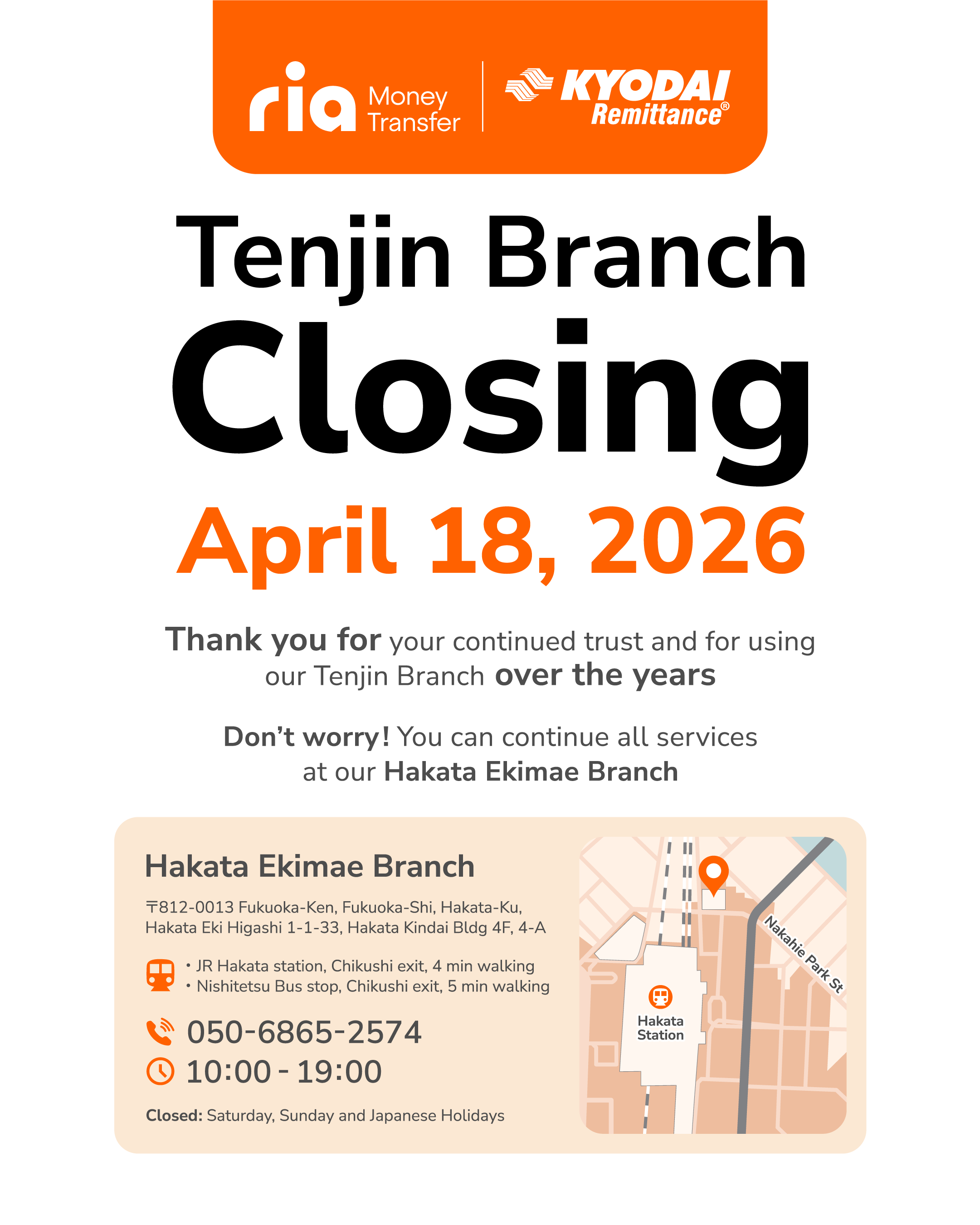 Nearest branch is Hakata Eki Mae branch, 4 minutes walking from Hakata Station. Also you can use our digital services using our App and cards to continue sending money to your love ones. For inquiries please contact us.