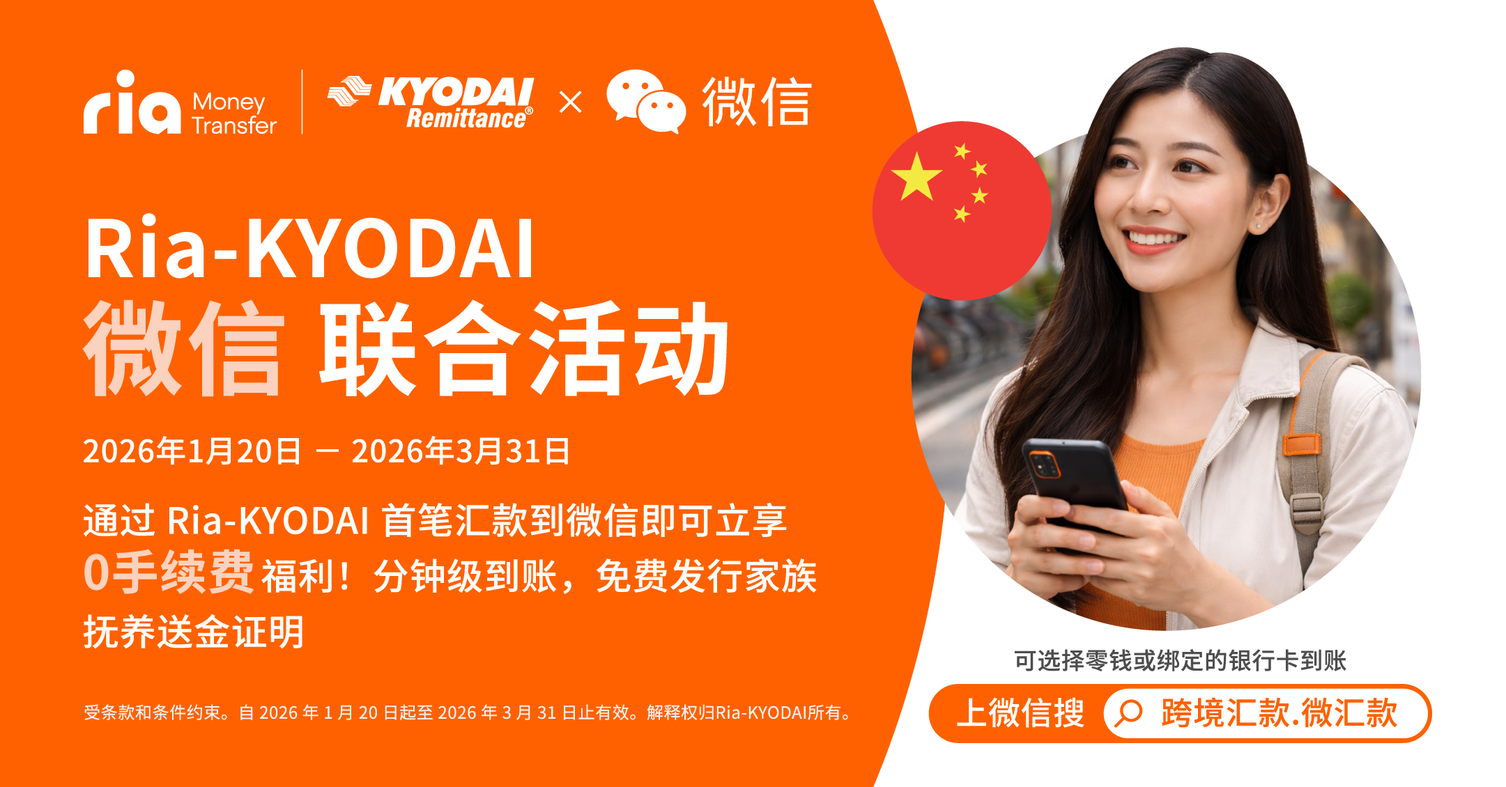 Ria KYODAI Japan will waive the first remittance fees for WeChat transactions during the campaign period.