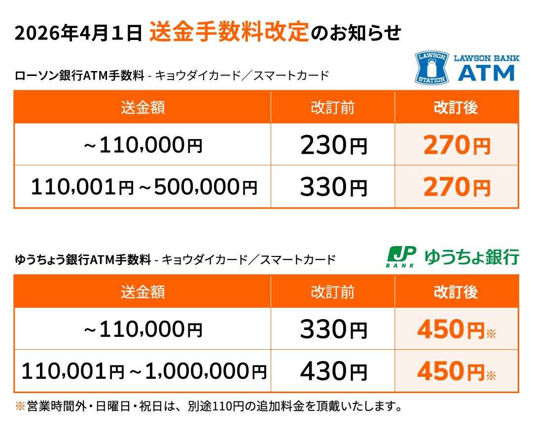 2026年4月1日(水)よりATMご利用手数料を改定させていただくこととなりましたので、お知らせいたします。 改定後のATM手数料は、下記の通りです。