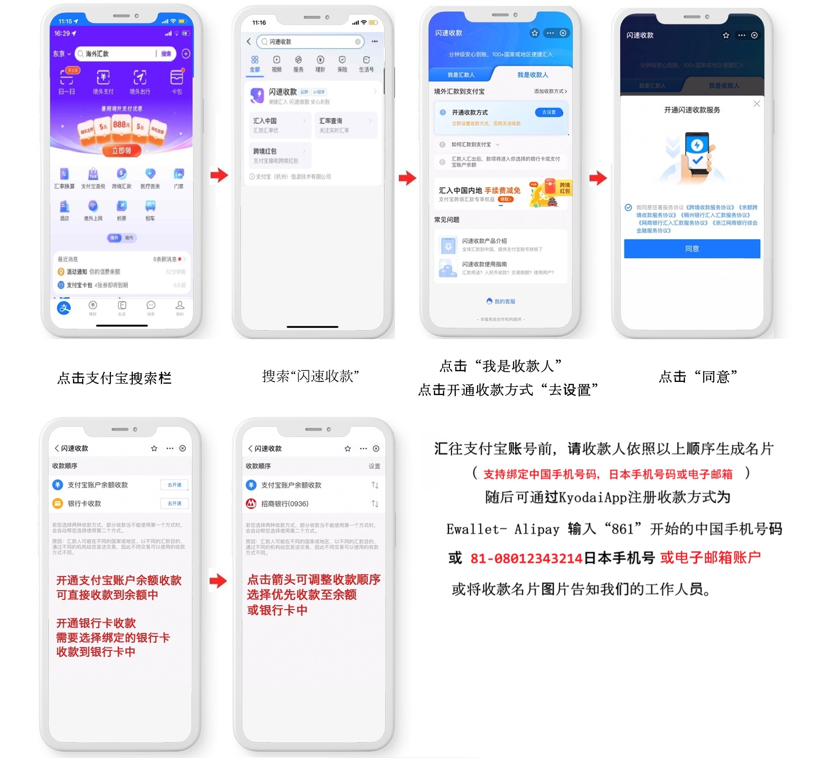 请切记汇往支付宝账户,你可以在收款名片中自由设置支付宝收款方式(请在汇款前设置完毕)
