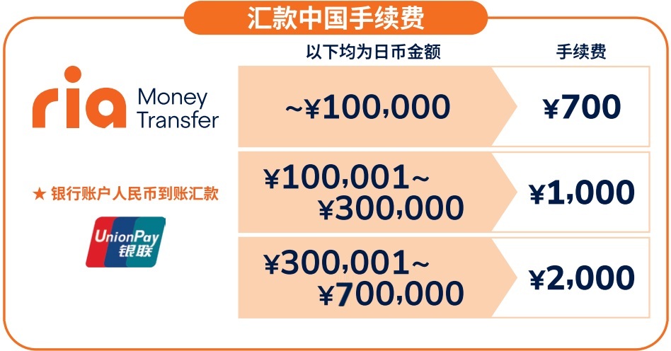Ria银联账户汇款手续费如下 (表格显示为日币金额)